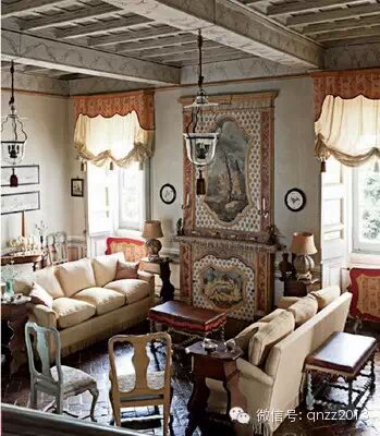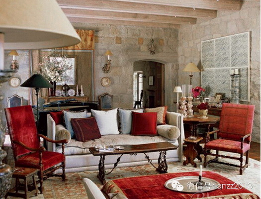 不显眼的灰褐色背景墙凸显了客厅中的异域图案和雕刻装饰,在惬意的田园气息中带来异域情调的神秘感。