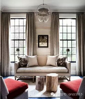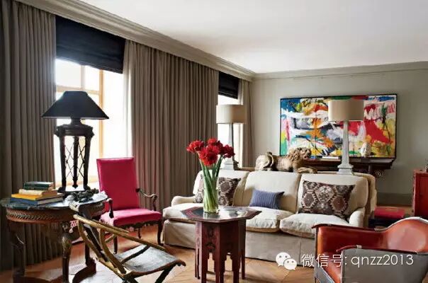 灰褐色的背景墙和窗帘搭上麻色沙发,使整个客厅显得自然质朴。强烈醒目的红色座椅及靠包的点缀,带来惊喜活力,营造出既优雅又热情的待客空间。