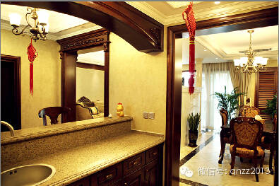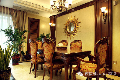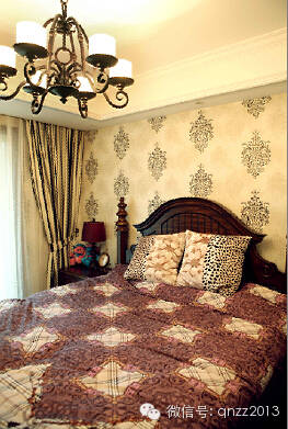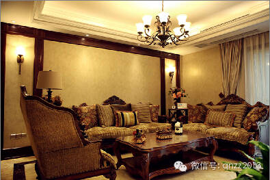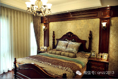 此背景墙应用了实木的造型,配合同色系的美式家具,在色系上即统一有协调。美式壁灯的加入,让这面墙更加出彩。
