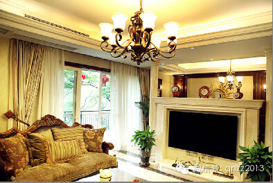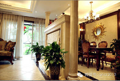 米黄石材的罗马柱让电视墙更上档次,更起到了分区的作用。