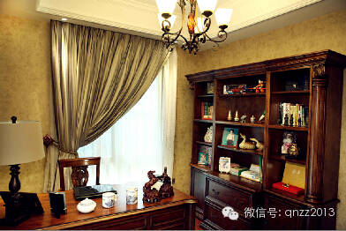 实木的美式风格家具配和米色的墙纸让书房更加稳重,也许业主在这个空间里会更有灵感。