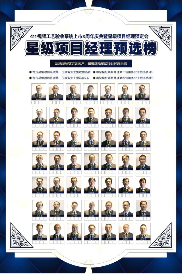 为庆祝”411视频工艺验收系统“上市3周年,远景特别推出星级项目经理预定会,现场签单客户可预定星级项目经理,享受星级项目经理周到服务!