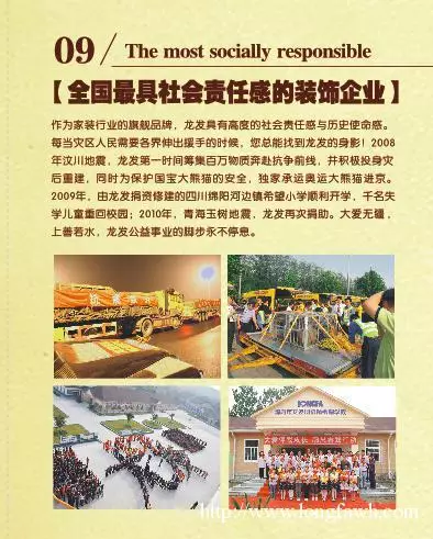 作为家装行业的旗舰品牌,龙发具有高度的社会责任感与历史使命感。每当灾区人民需要各界伸出援手的时候,您总能找到龙发的身影!2008年汶川地震,龙发第 一时间筹集百万物质奔赴抗震前线,并积极投身灾后重建,同时为保护国宝大熊猫的安全,承运奥运大熊猫进京。2009年,由龙发捐资修建的四川绵阳河边 镇希望小学顺利开学,千名失学儿童重回校园。2010年,青海玉树地震,龙发再次捐助。大爱无疆,上善若水,龙发公益事业的脚步永不停息。