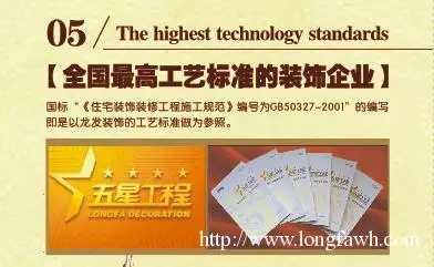 国标“《住宅装饰装修工程施工规范》编号为GB50237-2001”的编写即是以龙发装饰的工艺标准做为参照。