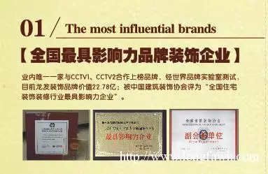 业内唯一一家与CCTV1、CCTV2合作上榜品牌,经世界品牌实验室测试,目前龙发品牌价值22.78亿;被中国建筑装饰协会评为“全国住宅装饰装修行业最具影响力企业”。