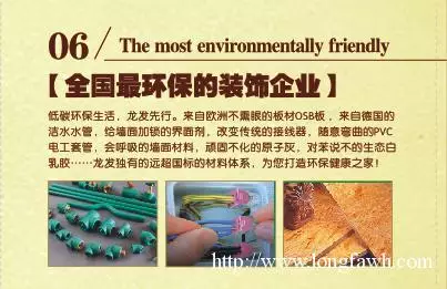低碳环保生活,龙发先行。来自欧洲不熏眼的板材EO板,来自德国的德标水管,给墙面加锁的界面剂,改变传统的接线器,随意弯曲的PVC电工套管,会呼吸的墙面材料,顽固不化的原子灰,对苯说不的生态白乳胶……龙发独有的远超国际的材料体系,为您打造环保健康之家