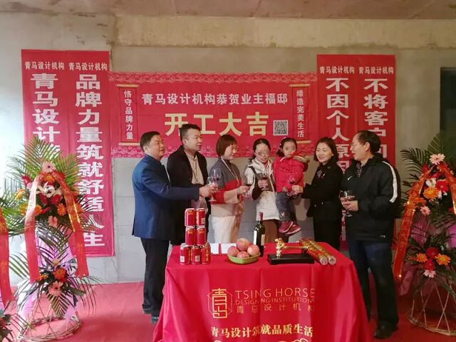青马设计机构与业主举杯共贺福邸开工。感谢相遇,感谢选择,共享开工美酒。