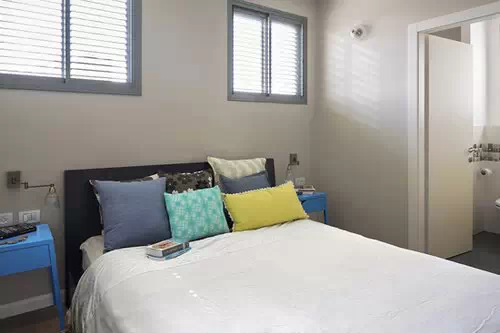 编辑点评:主卧风格简约舒适,色调上也延续了客厅的蓝黄灰搭配,让空间显得更为和谐与连贯;床头靠近窗户,有效地补充光源,对称的床头比例也增加了空间的平衡美感。