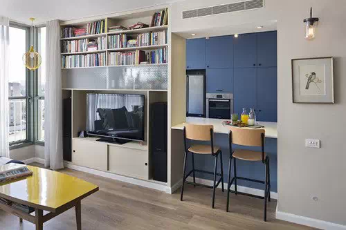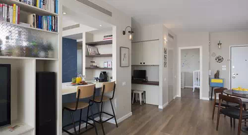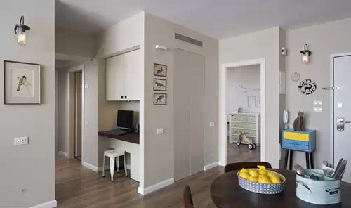 我很喜欢简欧的小情调,然而户型小,开始的时候恐怕到最后达不到想要的效果图。而且收纳设计是小户型的头等大事,不过在这套简约欧式风格的小户型中,所有的收纳区都采用内嵌于墙面的设计,完全不占用公寓的空间。除了打造内嵌墙面的收纳区,设计师还开辟了一个内嵌式的小书房,完全不浪费任何一寸墙面。紧凑的空间布局,悦目的色彩搭配加上趣味的涂鸦墙与墙面彩绘,让小公寓舒适感和魅力满分。