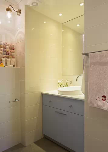 编辑点评:淋浴区背景墙打造内嵌式收纳区用于洗浴用品存放,再用可爱风的小瓷砖装修其墙面,让卫浴多了几分活力。