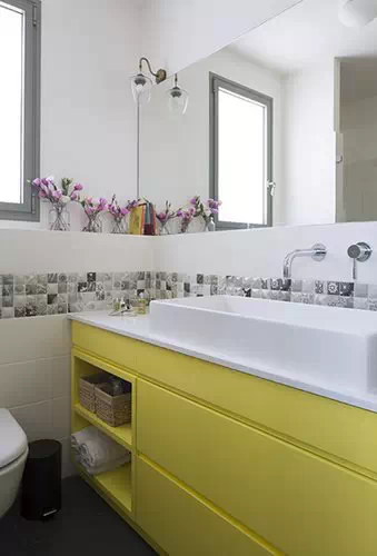 编辑点评:淡黄色的洗手台鲜活了卫浴的空间氛围,充足的收纳空间方便了卫浴用品的取放;背景墙中部的花纹瓷砖片区不但美化了空间,更增加了墙面的层次感。