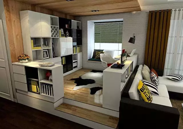 利用木制天花板分割空间,在客厅里打造一个台阶区,既可以作为书房,也可以作为休闲区。