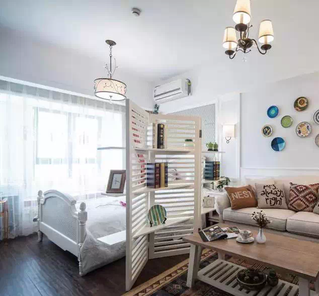 小户型设计注重区域的共享性与实用紧凑,比如这个格栅屏风,既保护了睡眠区域的私密性,还兼顾了置物收纳和美观。半隔断半开放,保证小空间的开阔度。