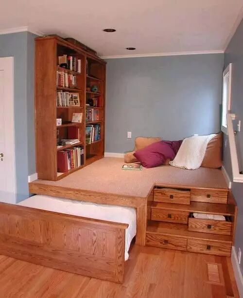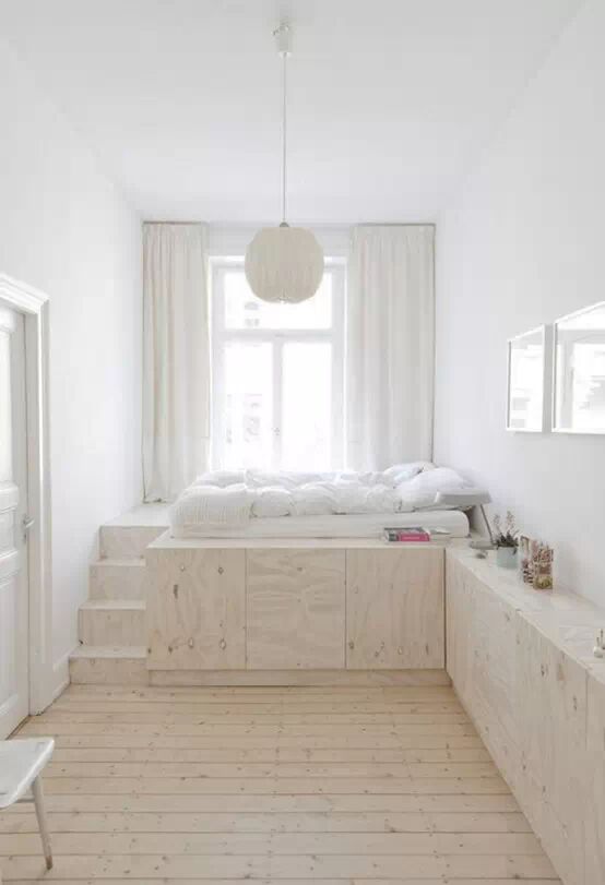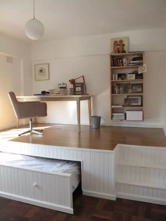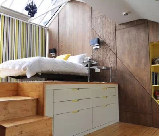 如果我们把阁楼空间或高平台和多功能家具结合在一起使用,就可以为家里增加很多空间。我们可以充分利用家里的阁楼或凸起的平台,增加一些抽屉或家具,就让家的容纳能力更大,也更整洁。一个单一的平台可以将房间分成上下两个或三个功能区,给存储东西提供方便。