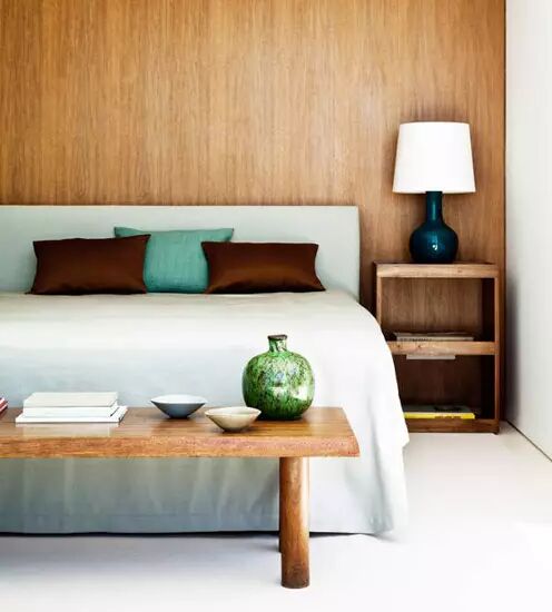 编辑点评:木质装修的床头背景墙自然环保,与木质床头柜几乎融为一体,收纳隐藏于无形。包覆床架的大床自然地融入整体,使卧室空间更饱满。
