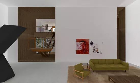 编辑点评:浅驼色的地毯划出了客厅区域,与橄榄绿色沙发和谐搭配。楼梯区域的墙体采用木质材料装修,与白色背景形成强烈对比,从而使楼梯形成立体空间