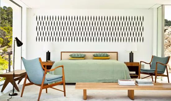 编辑点评:众多的线条组合在一起就像是巨幅的编织图案,不但美化了床头背景墙,而且让卧室充满线条感;桌椅的摆放也让空间布局更紧凑和平衡;两侧大面积的落地玻璃窗使卧室处于半开放式状态,拓宽了视野也照亮了空间。