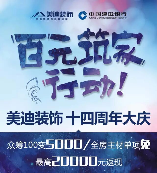 今年美迪装饰14周年庆亮出了一张亲民牌,推出“百元筑家行动”,让所有人都能享受到中高端装饰领导品牌美迪装饰带来的美好。即业主在线支付100元,即可享受上门量房、出平面方案、报价等VIP服务,另直接抵施工款500元,还可获得通程电器无门槛100元现金券一张(无须满额减,一件商品也能减钱)。