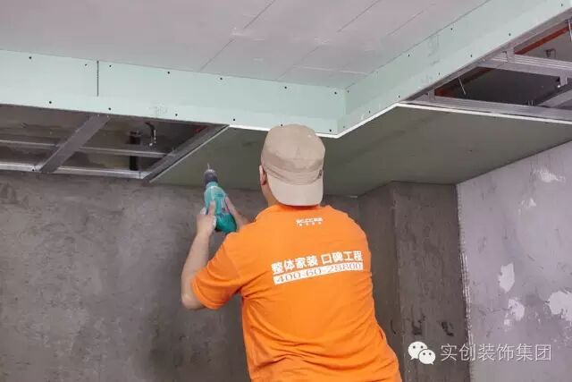 在吊顶的处理上,实创采用了底板托侧板和7型版拼接两大工艺。因为吊顶采用的是轻钢龙骨骨架和石膏板拼接方式,90%以上的吊顶开裂都出现在接缝处,底板托侧板和7型板拼接两大工艺最大程度减少接缝重叠处的开裂。