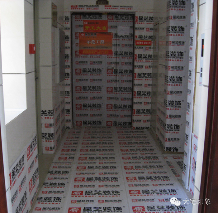 现场公共区域的保护,一般公司在保护上更多的是室内,过道公共区域其实也是很重要的,这个是我们业主的公摊面积,很多业主家里装的是很漂亮,但是公共区域缺乏保护,阳角就非常容易破损。