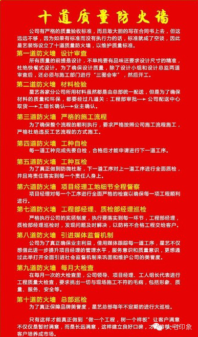 先简单给您介绍一下星艺的十道质量防火墙,装修的质量一定是紧盯与细节管理!