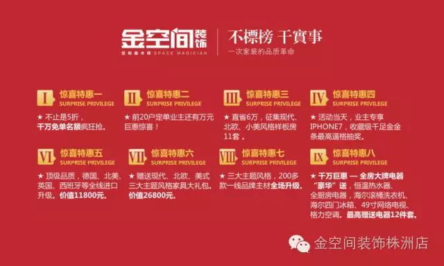 本次活动将和天猫双十一激情碰撞活动以“装修不止五折”为口号,做到真正意义上的价格大解放。并特邀搜狐网、大湘网等专业媒体全程监督,助力广大业主打造无忧家装、环保家装、实惠家装,意在感恩回馈新老客户长期以来的支持与厚爱。这次广电样板季家装双十一钜惠活动是金空间装饰成立20年来最大的一次价格优惠活动,价格优惠好礼多多为您省钱!活动期间装修不止是5折,千万免单名额疯狂抢,三大主题风格,200多款一线品牌主材全场升级。前20户定单业主还有万元巨惠惊喜!