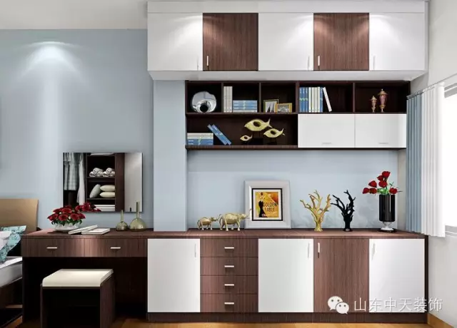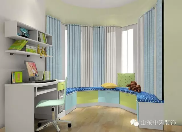 在这个房价上涨的时代,大多数人选择了购买毛坯房,但是面对这种不规则弧形的房间是如何装修设计的呢?类似这款毛呸房图,在窗下设计一组柜体拼搭,形成一个弧线的飘窗。连接底柜设计一款电脑桌,不仅兼备了书台和书柜的功能,还使用性效果强。而且电脑桌的颜色搭配、柔软靠垫和蓝白色窗帘的装饰,使整个房间瞬间变得温馨起来。
