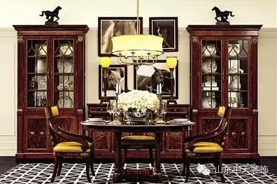 有人说,吃饭就好比一种仪式,是家庭成员间情感交流的一个舞台。在这个餐厅空间里,无论是餐桌、餐椅还是餐边柜,都充满了一种帝政式的风格。这种从古罗马建筑中汲取灵感,通过经典元素的运用,让整个空间都散发出古典和庄严以及高贵的感觉。家具上铜材质的使用突出了格调,而桃花心木搭配各种名贵木皮则凸显了品位。试想一下,当一家人围坐在一起,讨论工作、生活中的趣事,应该是一件特别开心的事。