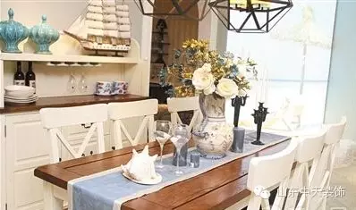 简美风格是近年来流行的一种,对于许多年轻人来说,欧式与中式的家具风格显得繁复,而日式家具风格因过于追求简洁而显得单调,简美风格无疑中和了二者。简美风格的家具简化了仿古风格一些复杂和繁琐的元素,但保持了原有的流畅弧度与线条,使其看起来仍然含蓄而又清新。清新的白色搭配木色显得格外休闲,而餐桌上摆放的蜡烛、花瓶以及餐边柜上的帆船装饰都让这种闲适弥漫在整个餐厅空间里。