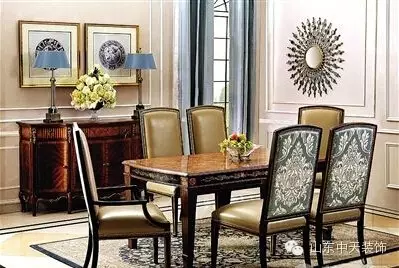 一提起英国,很多人首先想到的就是女王、贵族和绅士,而小餐桌则是英伦精致生活的体现。这个餐厅里充斥着浓浓的英式氛围,餐桌采用了乔治王朝后期流行的上粗下细带槽纹方形腿,结合略带弧度的线条与雅致的木皮贴面,将英式家具在新古典时期的芳容身姿展露无遗。如果再搭配上流光溢彩、贵气不俗的扶手椅,生活就更完美了。在这个餐厅中来一场优雅的下午茶,或许那种贵族的气质就慢慢养成了。