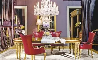 红色与金色的组合呈现出特别的奢华感,纯手工制作让整套家具都多了尊贵的感觉。如果是一个大家族,这种颇具气势的金色餐厅绝对是最好的选择,分长幼次序依次坐好,甚至还有专门的服务人员,这样周到的享受或许就是奢侈生活的一部分吧。巨大而璀璨的水晶吊灯则让整个空间更具尊贵的感觉,更加符合奢华的气质。
