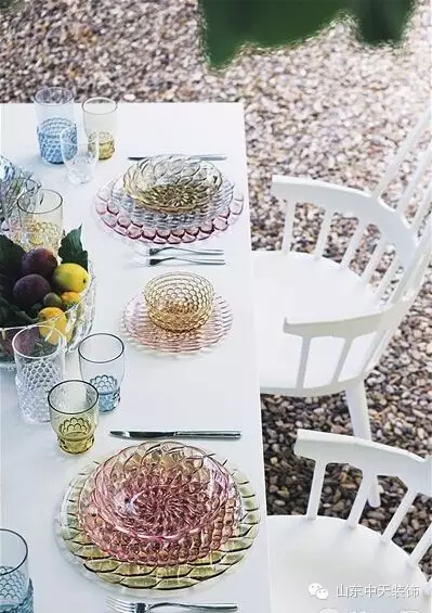 般来说,主人的品位及性格、所处的环境和生活状态,都直接关系到他对用餐空间的认识和理解,也就左右着餐厅的个性。而餐桌椅、餐具等所构筑的用餐环境也会反过来作用主人用餐时的心情。所以,和谐搭配餐厅,也就是在和谐搭配自己的心情,塑造自我的生活空间。当把餐厅放到户外时,白色绝对是最适合的颜色,因为室外的任何一个风景都是最美的装饰。而餐桌上各色剔透的餐具则让餐桌活泼了起来,清新的风也吹了过来。