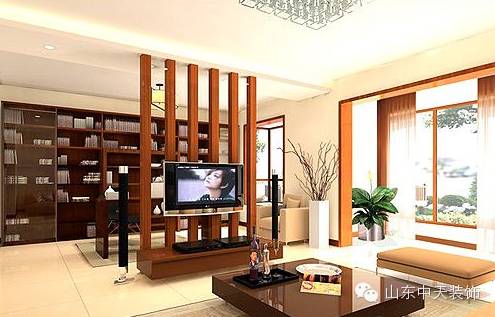 客厅跟书房原本有一面轻体墙,在本案在把这面墙已经拆掉,书房跟客厅一个空间。书房跟客厅中间一个装饰隔断,这样既能把客厅跟书房在视觉上分割开,又能做电视背景墙的装饰效果,软性的分割空间把两个空间相互利用,古色古香的书房衬托出客厅现代的家具,使这个厅显的更现代化了。