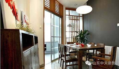 餐厅:经过改造,餐厅与厨房成为同一个整体空间。一面整体的装饰柜便完成了餐厅所有的储物任务,中式风格的推拉门也是一种装饰。餐桌由大毛竹合抱而成,别具一格。