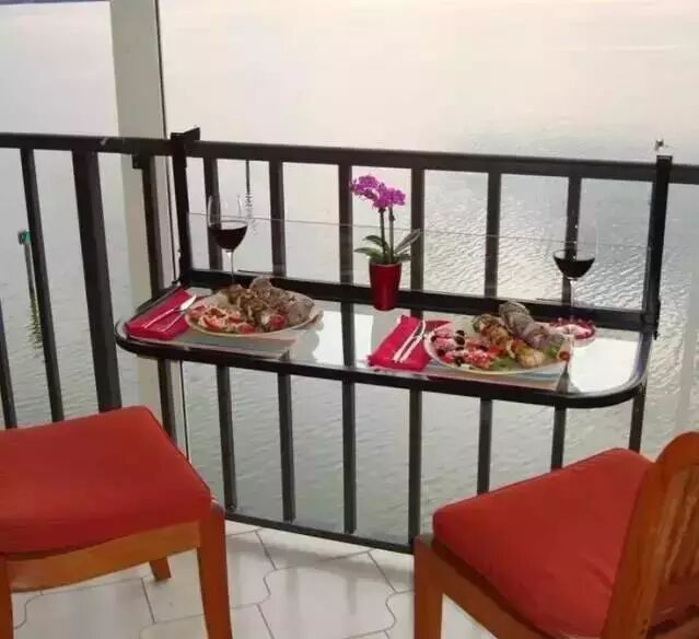 折叠式桌椅,平时是阳台地板,用的时候拉起来就成了桌椅。