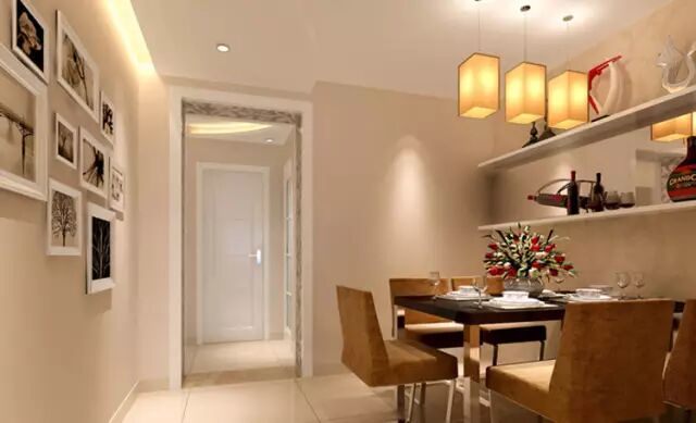 餐厅空间位于客厅及走道之间,起到承上启下的作用。隔板设计增加了摆设和储物,照片墙的设计记录着小两口的点点滴滴,每次看到这些,总能有轻松愉快的心情。
