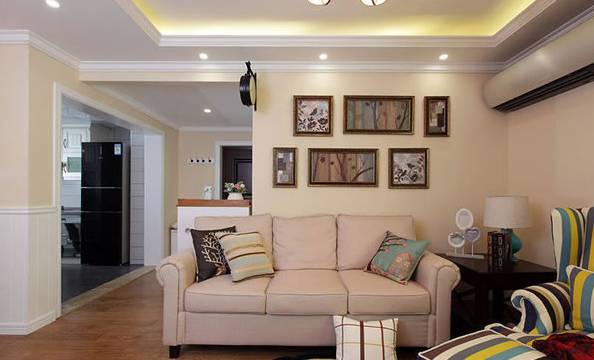 米色墙面营造整体温馨舒适的感觉,电脑区的设计增加实用功能,镂空隔断设计及吊顶空间的分割,合理划分了空间,周末窝在这样的客厅,一家人吃些水果、看看电视,生活有滋有味。