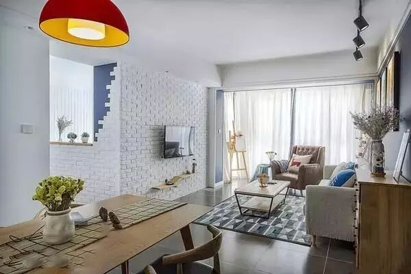 ▲电视背景墙采用白色仿古砖,搭配波浪形的搁板,动感十足。