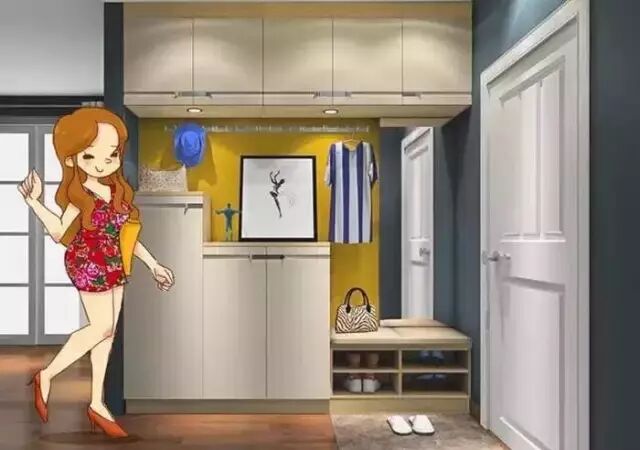 延长客厅背景墙隔出一个玄关,高低鞋柜收纳冬靴凉鞋,更有吊柜、穿衣镜,换鞋凳,户型再小该有的功能一个都不能少!