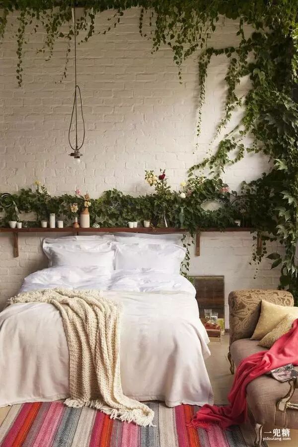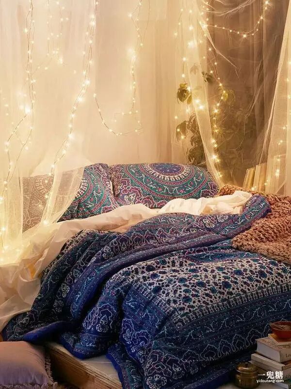 你可以用白色透明的纱帘,也可以用轻薄的布,支起这样一个帘子来罩着你的床,会有种小时候躲进床单被子做成的堡垒的感觉,不过一定要注意哦,纱帘和蚊帐可是绝对不一样的,密度和用料都有不同,另外就是用来装饰的纱帘会漫不经心一点,随意地垂下,千万不要像蚊帐一样紧绷绷地压在床铺下固定。