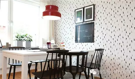 编辑点评:餐厅桌子旁边铺满几何图案的壁纸,让墙面不单调,而三幅挂画更是凸显出极简的北欧风格装饰。