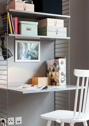 编辑点评:小小书桌台,没有收纳柜也没关系,有墙壁收纳板来帮你搞定。两条收纳板也可以收纳很多东西呢!