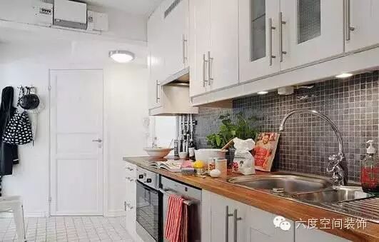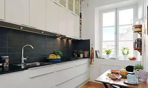 高低有序的吊柜给中规中矩的北欧式厨房中带来了一些层次感。白色瓷砖地面上铺就的黑色地毯是非常不错的色彩对比。狭长的户型就该采用这样的一字型橱柜。