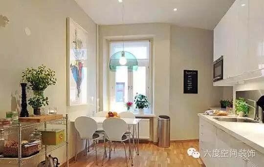 这个厨房空间有那么点不规则,内部明显多出了一个小角落,正好用来放上一个精致的收纳柜或者干脆让橱柜延伸出去,设计成一个小吧台。餐桌放在了光线较好的窗边,加上灯光的点缀,和温馨。