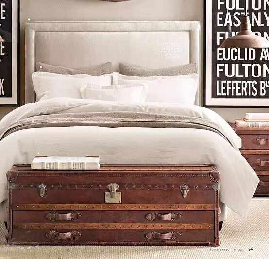 床尾放置的旅行箱和床头部分的柜子应该属于一个系列,这样的设计既美观个性,同时相信实际效果也很不错,内部肯定是充足的收纳。