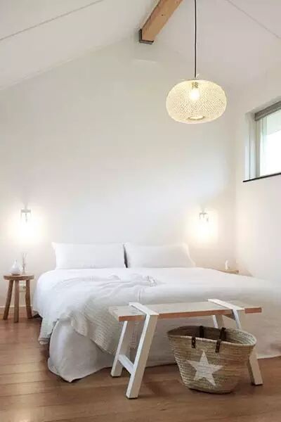 整个卧室本就非常简单,除了大件的床之外就无其他物品。所以在床尾部分就简繁放上了木制的板凳,构造简单,但是和整个卧室的气质却很相符。