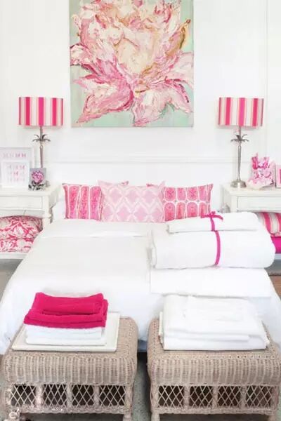 床尾部分放上了简单的两个藤艺板凳,不进可以随意坐坐,同时还是很好的摆放毛巾或者衣服的地方。卧室中白色和粉色的搭配也带来了不错的浪漫、可爱气质。