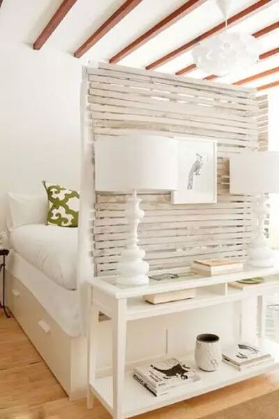 整个床架其实是比较简单的,但是床尾部分却高高挂起了一块板,起到了不错的视线阻隔作用,朝外的部分被挂上了木栅栏一样的装饰物,西方放上了简易收纳柜。很实用。