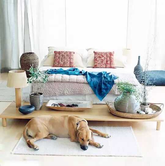 床尾部分除了中规中矩的放上床尾凳、沙发、收纳之类的东西外还能放上装饰用的长条案几。图中的设计就不失为一种极具个性的代表。低矮的案几可以放上不少东西,绿植、装饰都可以。