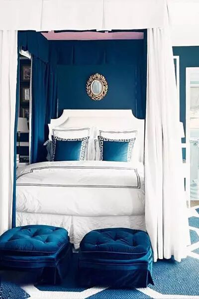 白色和深蓝色卧室色彩搭配,雅致风格一下子就呈现出来,床架上有厚厚的帷幔,让卧室不显单薄。床尾部分空间不是很大,所以简单的放置了两个同色系的深蓝色布艺软垫,很好的和白色床品搭配在一起。